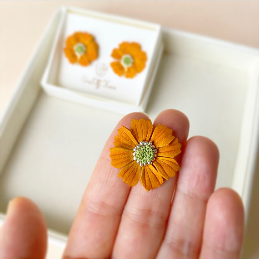 ※本ハンドブックは、2021年に制作した「キバナコスモス(オレンジ)革花ピアス/イヤリング」をもとに、型紙を新たに作り直し、現在のノウハウを取り入れて、よりわかりやすく・作りやすい内容に再構成しています。掲載している作品写真は当時のものですが、解説内容は最新の技術を反映しています。